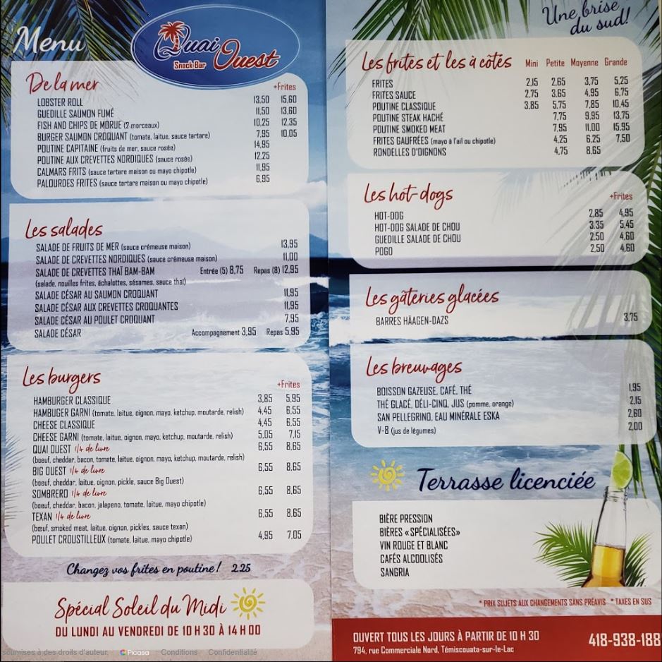 Le restaurant Snack Bar Quai Ouest resto de Témiscouata-sur-le-Lac (Cabano) vous proposes un menu varié: hamburgers, hot-dogs, salades, frites et poutines, fish and chips, crevettes, calmars, palourdes et bien plus. Venez manger sur la plus belle terrasse de la région!